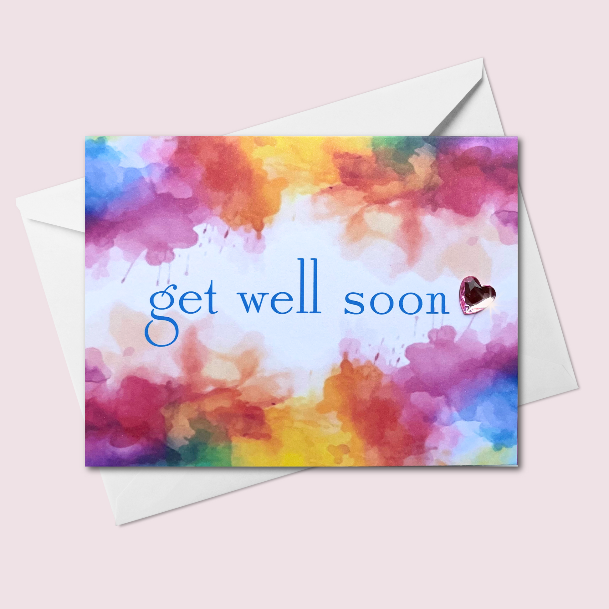 Send a little sunshine and encouragement with this vibrant “Get Well Soon” card! Featuring a rainbow watercolor background and a sparkling heart gem, this handmade card is the perfect way to lift someone’s spirits during recovery.