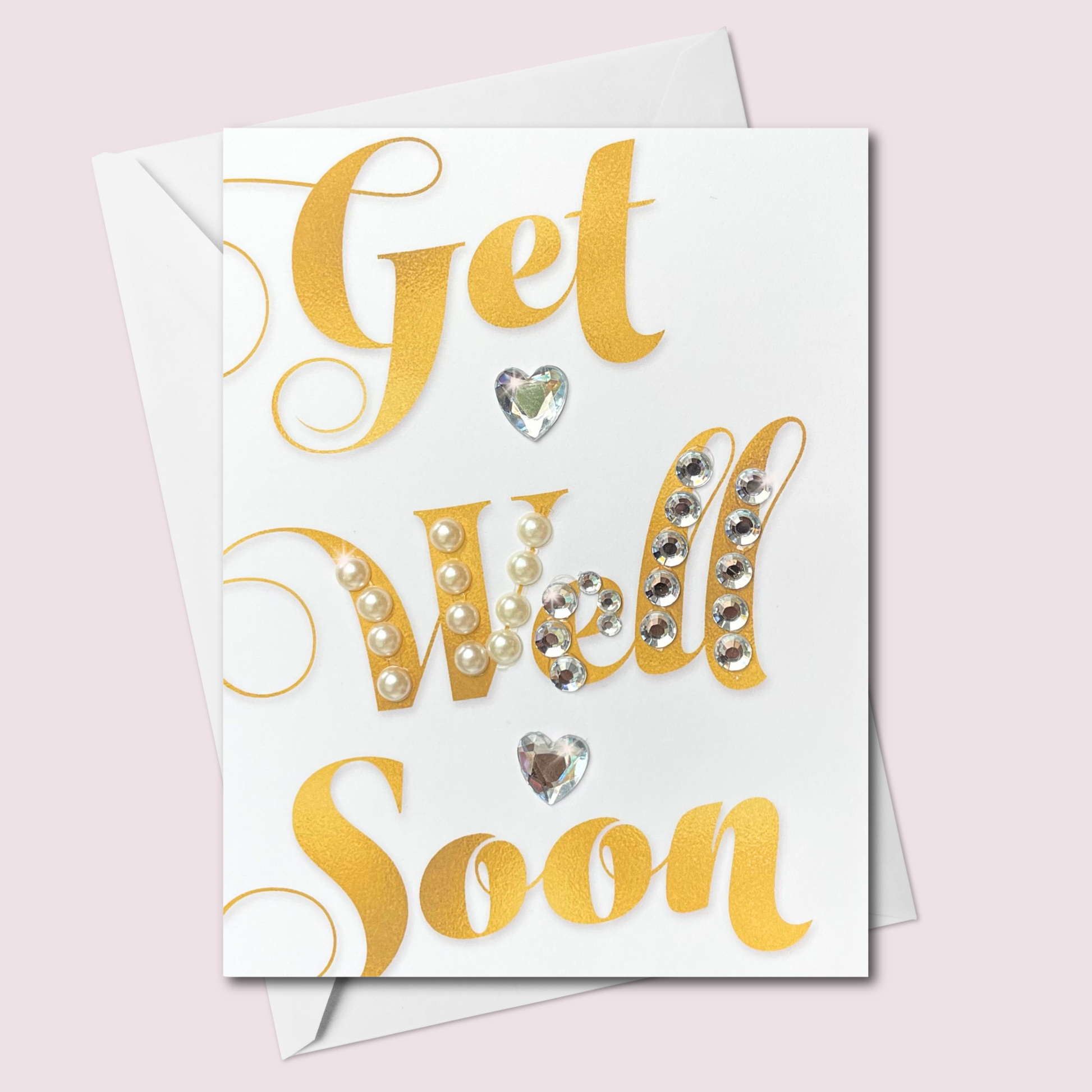 Get Well Soon Card – Elegant Gold Print with Pearls and Rhinestones
