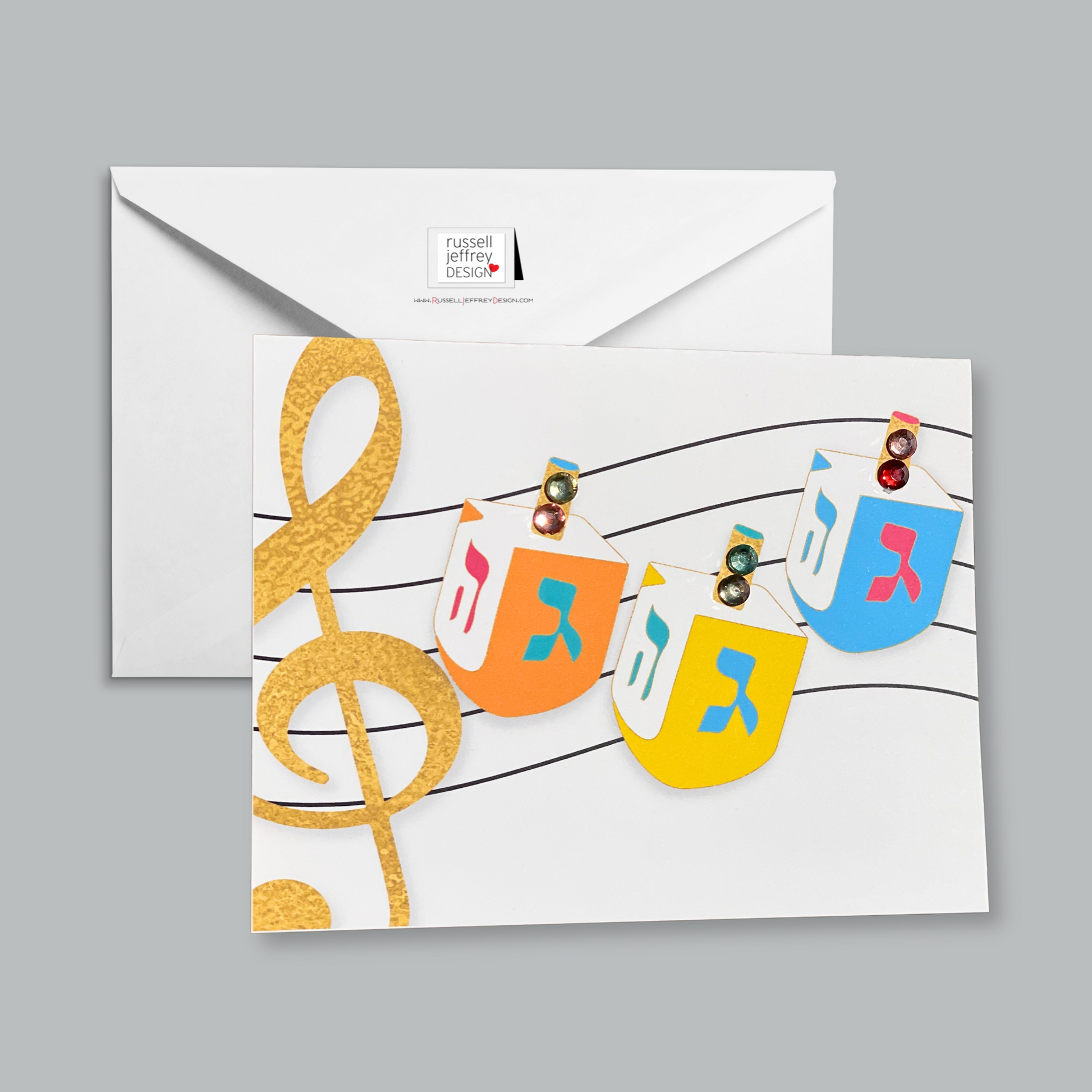 "Dreidel, Dreidel, Dreidel!...." This card adds light and music to your Channukah celebration with these dancing dreidels.