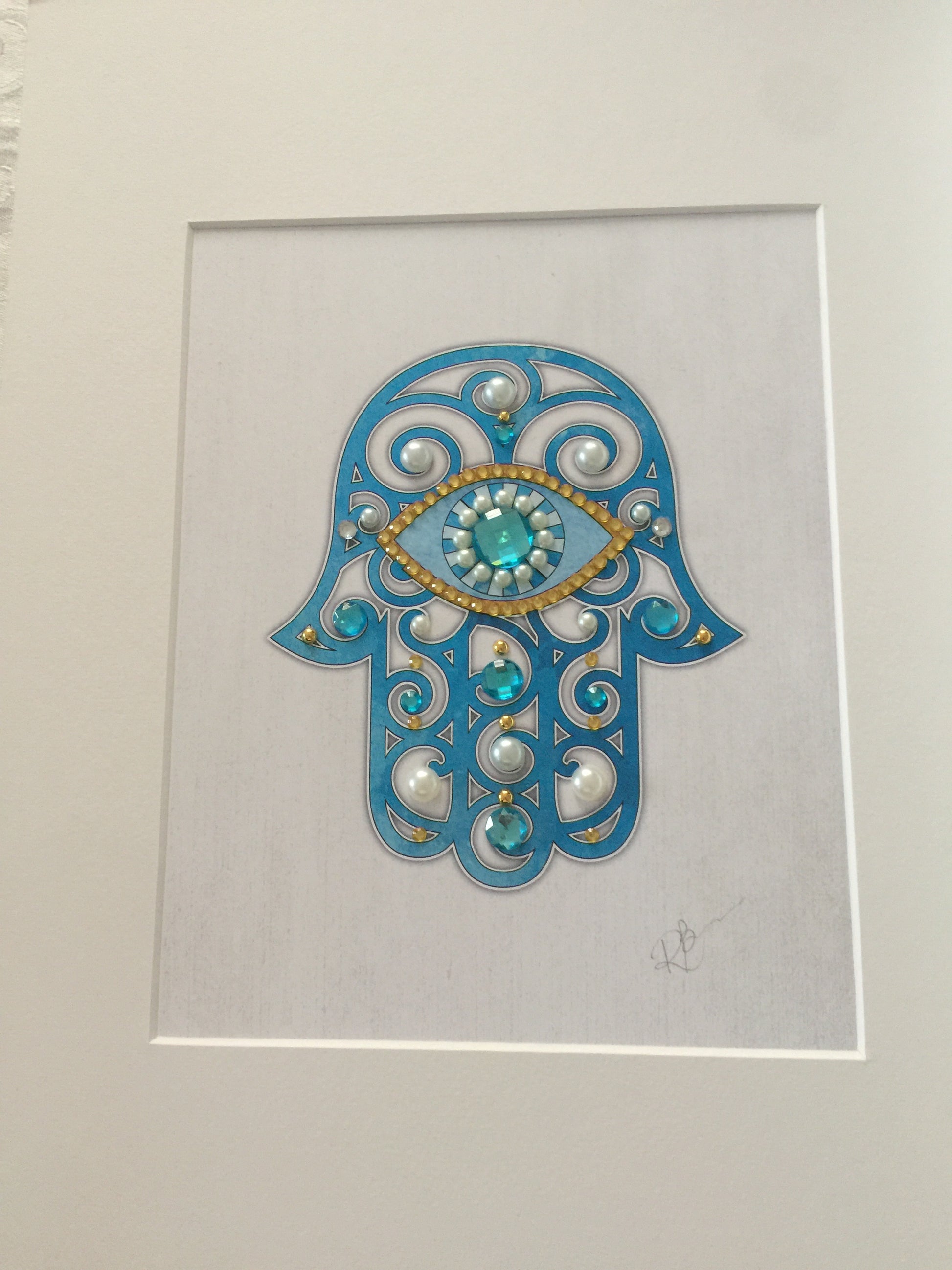 Hamsa Hand Artwork Blue with Gold Eye - Framed